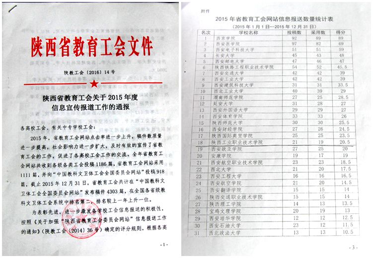 据悉,为适应工会宣传工作发展新形势的需要,我院工会2015年开通了微信公众平台(陕西工院职工之家)和微信群(陕西工院工会),第一时间将教职工息息相关的信息推送出去,受到全院教职工的高度关注。院工会2015年度根据陕西省教育工会网站栏目调整的实际,严格按照稿件文字内容、图片格式等的要求,向省教育工会新闻投稿格式规范、图文并貌、及时准确。2015年1至12月共向省教育工会报送我院工会工作的新闻报道21篇,经省教育工会转发在中国教科文卫体工会网站发布新闻报道19篇,无一退稿。相较往年投稿数量虽然变化不大,但质量不断上升。我院工会部分稿件还相继被省教育厅网站、省教育网等多家平面或网络媒体转载。院工会通过相关媒体全方位、多角度、立体展示了我院教职工的风采和工会工作的方方面面,使省教育工会网站更好的发挥宣传、沟通交流的作用,突出了我院工会内练素质、外塑形象的理念,有力的凸显了“陕西工院”的品牌效应。