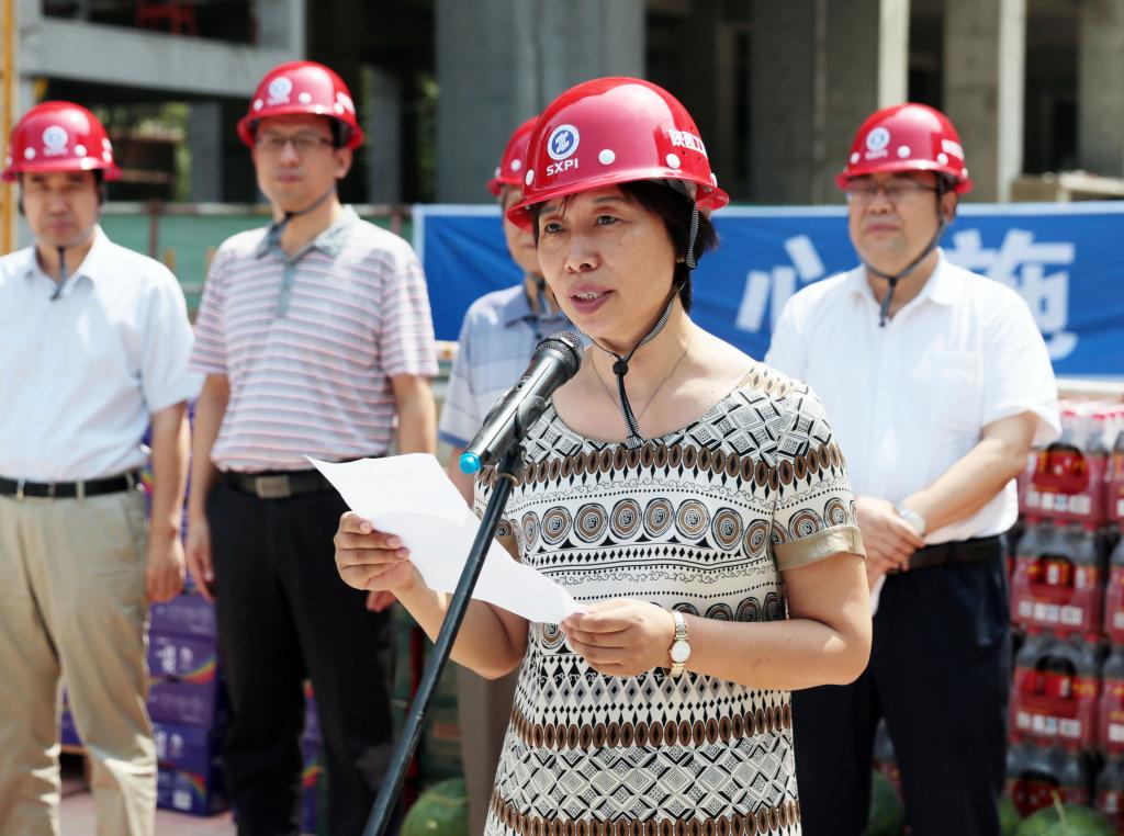 陕西三建集团副总经理黎晓东代表建设单位发言,他说:省教育工会和陕西工院领导的关怀和慰问,就像夏日的徐徐凉风,让大家倍感舒畅,三建集团一定不辜负组织期望,严把工程质量关和安全关,顺利完成陕西工院工程技术训练中心大楼暑期施工任务,以优质工程为陕西工院的建设发展贡献自己的力量。