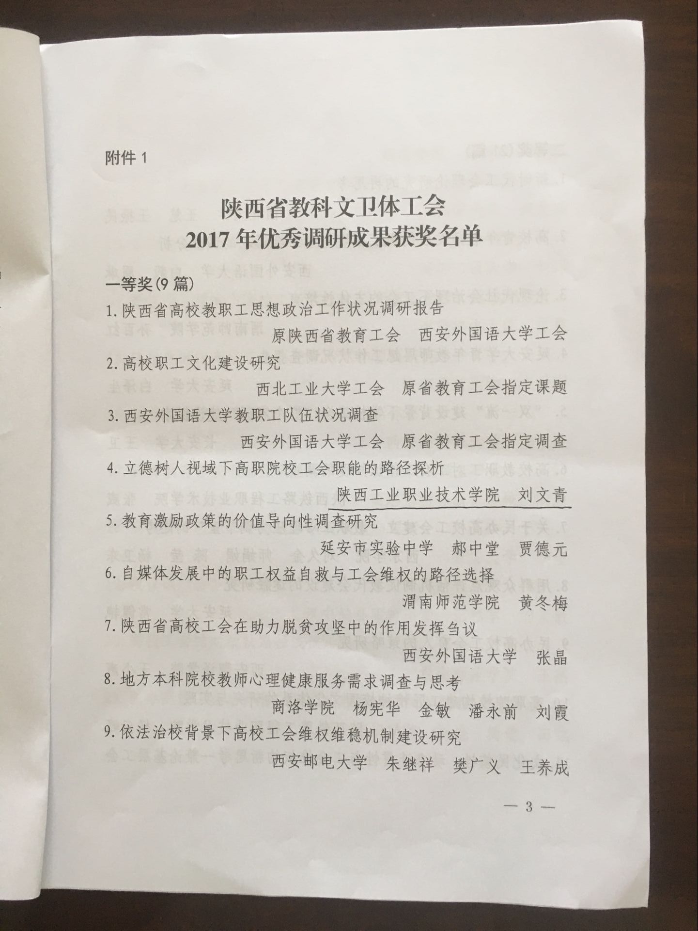 ,陕西省教科文卫体工会在全省教科文卫体系统工会女工干部培训班上,通报表彰了2017年度优秀调研成果和优秀调研单位的(陕科文卫体工字[2018]17号)。我院2017年工运理论研究硕果累累:工会主席、统战部长刘文青获优秀调研成果一等奖,段文杰和工会祁广科老师获优秀理论研究成果三等奖。刘文青同志出席培训开班仪式并代表学院上台领奖。至此,我院工运理论研究工作已经连续七年获得省教科文卫体工会通报表彰,这也是历年来我院工运理论研究工作获奖最多的一次。