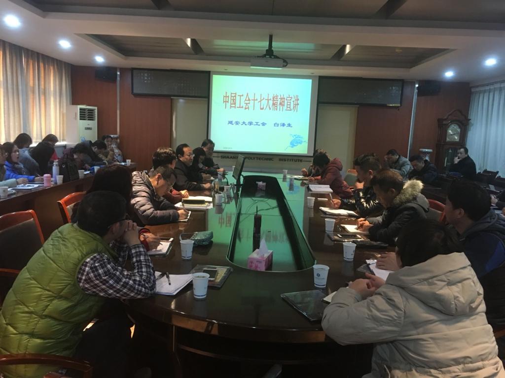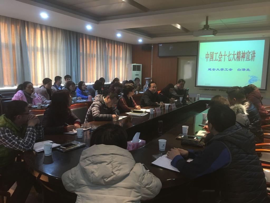会上,中国工会十七大代表、延安大学工会主席白泽生教授作中国工会十七大精神专题报告。他从10月22日至26日在京召开的中国工会十七大基本情况和我省代表团参会过程;中国工会十七大的主要精神;中国工会十七大陕西代表团有关情况;中国工会十七大的理论成果等四个主要方面,详细解读了刚刚盛开的中国工会十七大。详细传达了李克强总理在中国工会十七大上所作经济形势报告的主要精神、王沪宁同志致词的主要精神、王东明主席所作《工会工作报告》主要精神,说明了关于《中国工会章程(修正案)》修改的原则和修改的7处内容。结合自己20多年的工会工作经验,深入浅出、生动形象的予以精彩讲解。