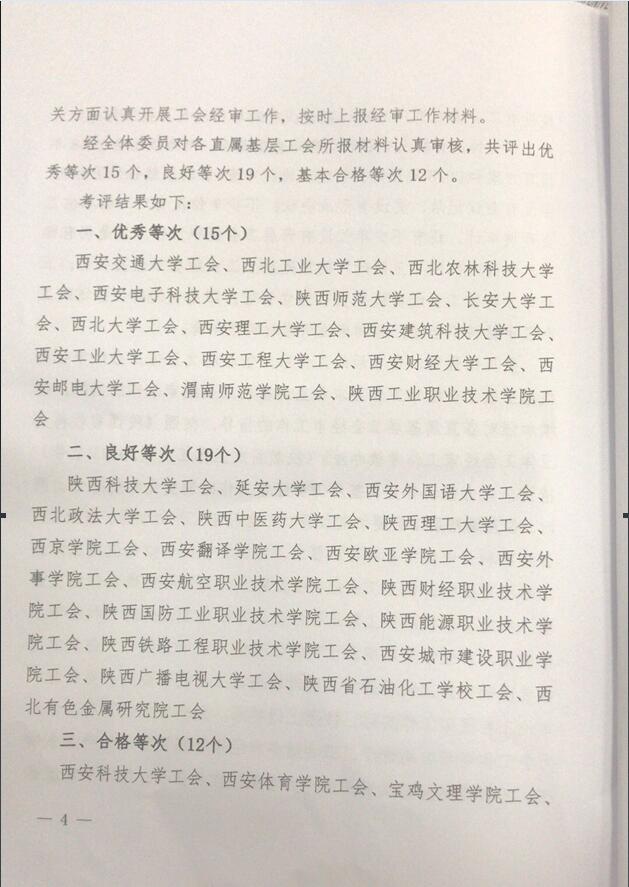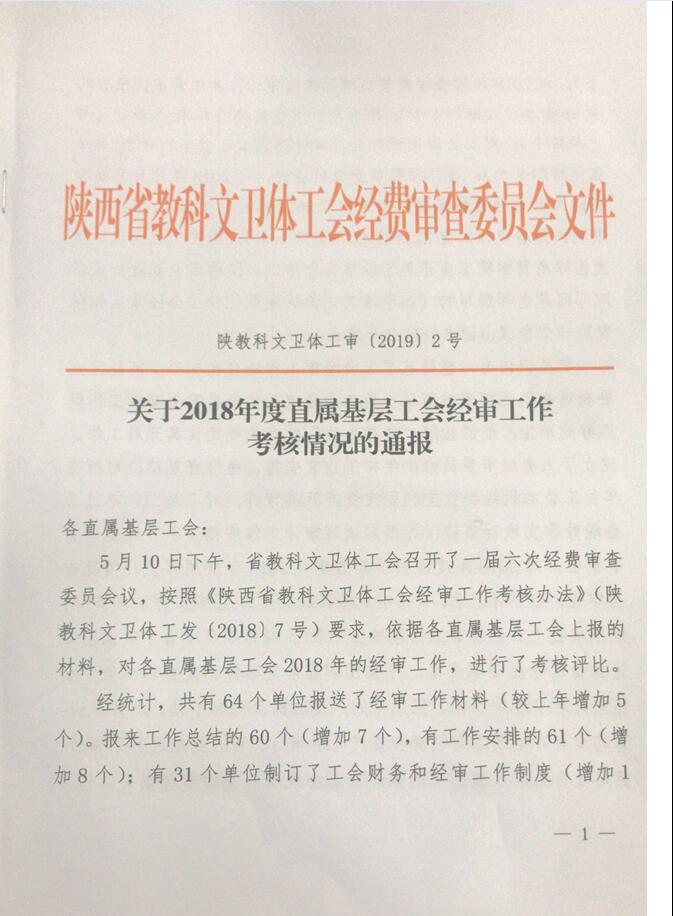 日前,陕西省教科文卫体工会经费审查委员会发出《关于2018年度直属基层工会经审工作考核情况的通报》(陕教科文卫体工审〔2019〕2号),通报了对全省64个基层工会2018年经审工作考核评比结果,并按照优秀、良好、基本合格三个等次通报表彰了46个基层工会,我院获考核优秀等次,全省高职院校唯一获此殊荣,我院工会经审工作已连续7年获得表彰。