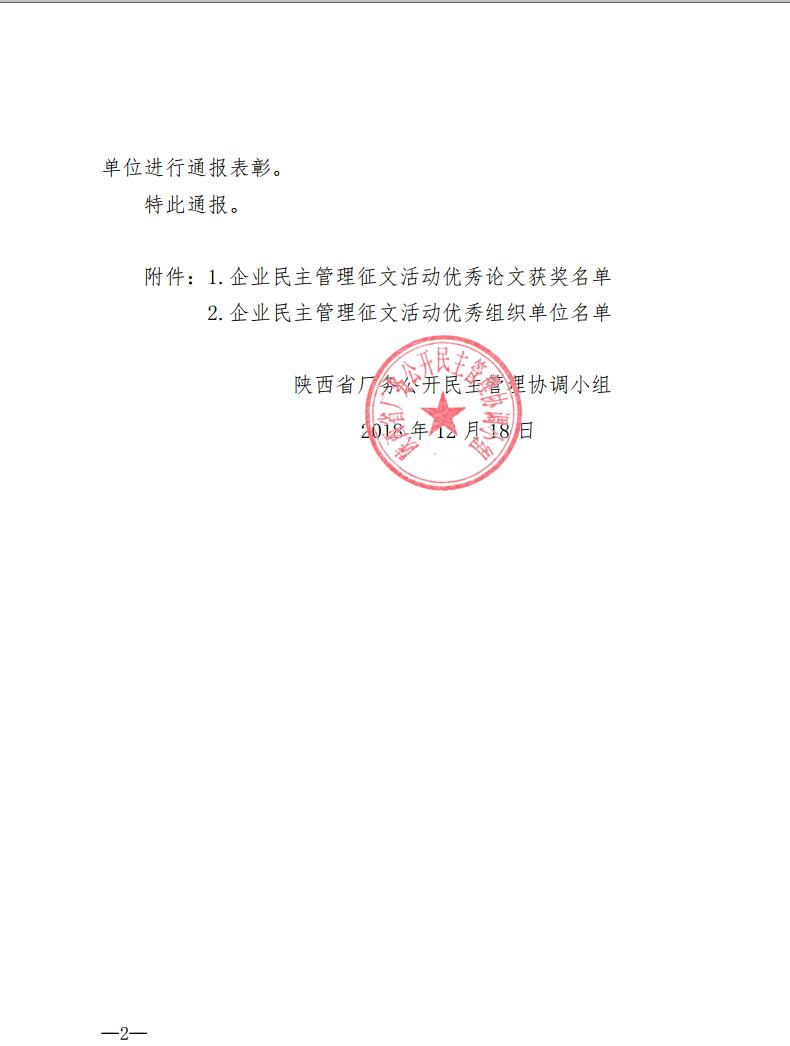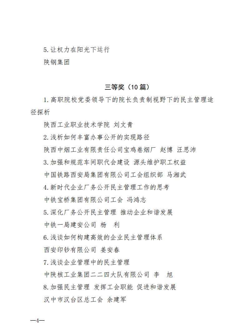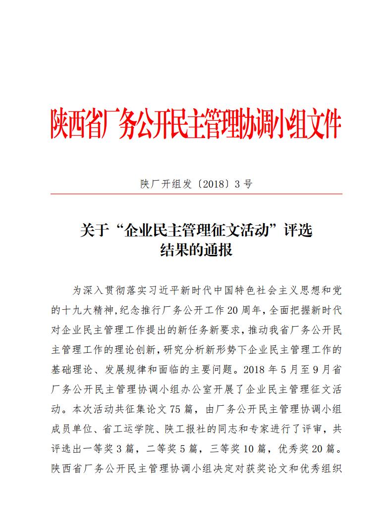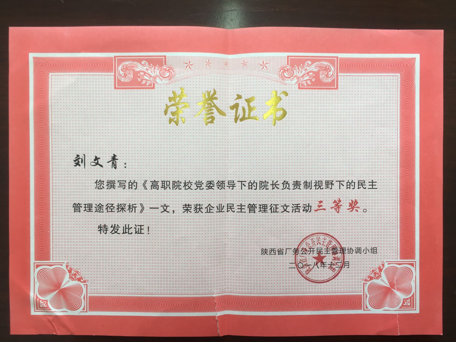 日前,陕西省厂务公开民主管理协调小组发出《关于“企业民主管理征文活动”评选结果的通报》(陕厂开组发〔2018〕3号),通报表彰了获得等次奖的征文,我院工会主席、统战部长刘文青同志荣获企业民主管理征文活动三等奖,我院首次获此殊荣,全省高职院校仅有我院刘文青同志唯一获奖。