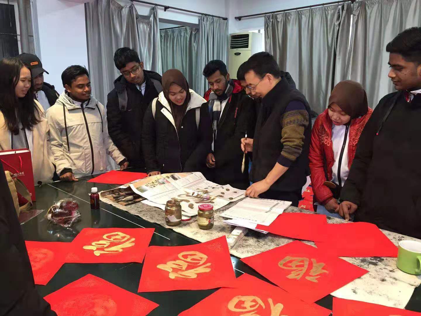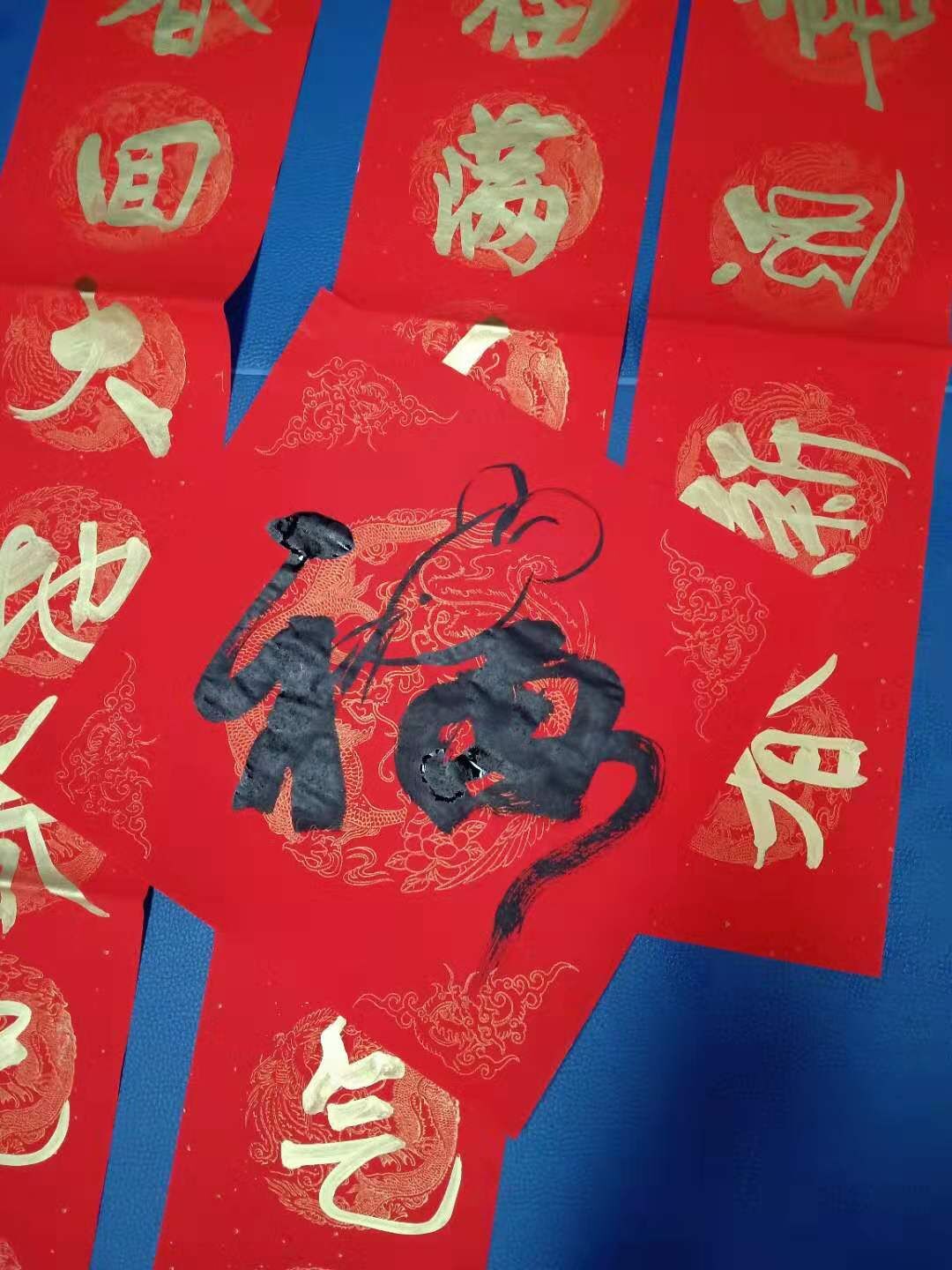 活动现场,备有事先写好的春联和“福”字向教职工发放,教职工也可自选或自拟春联内容,由书画协会会员现场书写。只见他们饱含热情,铺纸研墨,即席挥毫,行云流水间,一书而就,或遒劲有力,或飘逸隽秀,或龙飞凤舞,或潇洒灵动。“爆竹声声辞旧岁,红梅点点迎新春”是千年古风的传递;“鼠来豕去远 春到景更新”是生肖文化的执着;“物华天宝长安乐,人寿年丰大吉祥”“万里鹏程平地起,四时鸿运顺心来”……。一幅幅寓意祥瑞的春联和一个个饱含神韵的“福”字被送到教职工手中。顷刻之间,活动现场已成为一片喜庆的红色海洋。教职工们一边欣赏书法技艺,一边品评春联寓意,不时地啧啧称赞,并争先恐后迎“福”回家,喜悦之情溢于言表。活动还吸引了正在我院学习的国际留学生们的到来,工会王金省老师现场讲解了春节风俗的概况,春联这一中国特有的文学形式的文化内涵和书法书写要点;国际留学生们饶有兴趣的观看了春联的书写过程,并为中国文化的博大精深而赞叹。活动现场翰墨的清香与众人的欢笑,感受到了浓郁的传统文化气息,让浓浓的中国年味在空中不断流淌。