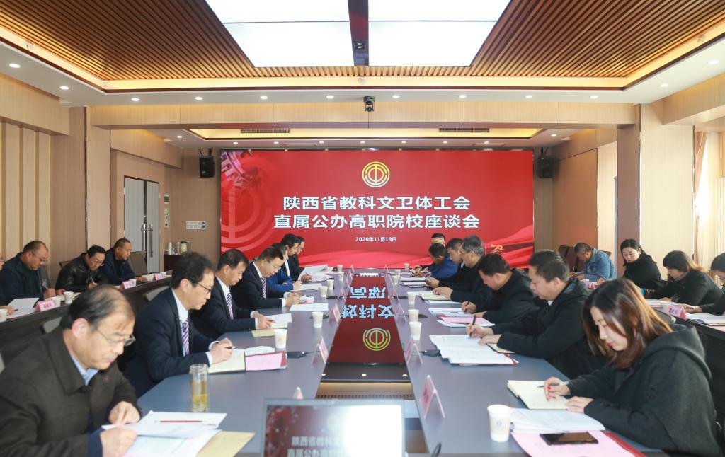 11月19日,陕西省教科文卫体工会直属高职院校座谈会在我校崇文楼9楼第一会议室召开。陕西省总工会党组成员、副主席安强,陕西省教科文卫体工会主席徐富权,副主席唐煜弢、夏明文等7位同志及12所陕西省直属高职院校的工会主席,我校党委书记惠朝阳、党委副书记贺天柱、工会主席张彬、人事处长殷锋社参加了会议。会议由陕西省教科文卫体主席徐富权主持。