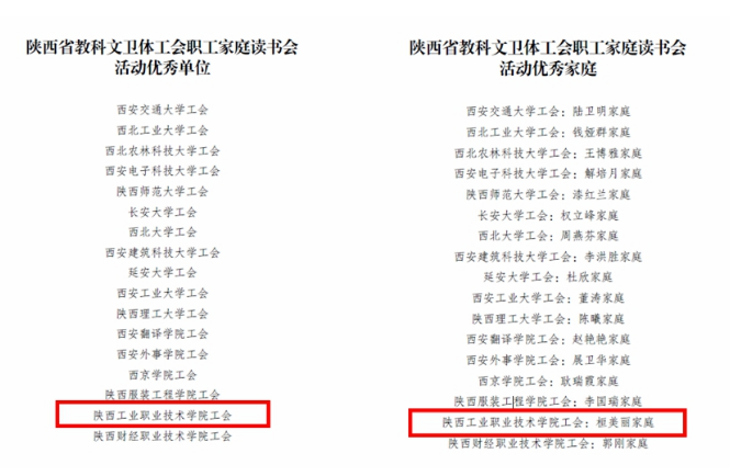 近日,陕西省教科文卫体工会印发《关于表彰陕西省教科文卫体工会职工家庭读书会活动优秀单位和优秀家庭的通报》,表彰了一批职工家庭读书会活动优秀单位和优秀家庭,我校工会荣获陕西省教科文卫体工会职工家庭读书会活动优秀单位荣誉称号,信息工程学院桓美丽家庭荣获陕西省教科文卫体工会职工家庭读书会活动优秀家庭荣誉称号。
