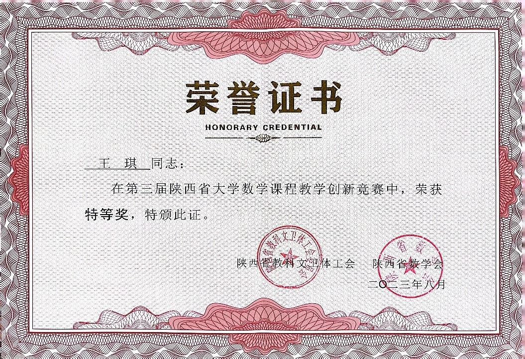 近日,第三届陕西省大学数学课程教学创新竞赛获奖结果公布,我校公共课教学部王琪、鲁明浩、张穗教师团队斩获特等奖,这是我校首次参加此项赛事并与省内本科院校同台竞技。本次竞赛共评选出特等奖5名,一等奖10名,二等奖16名和三等奖15名,我校是省内唯一入选并获奖的高职院校。
