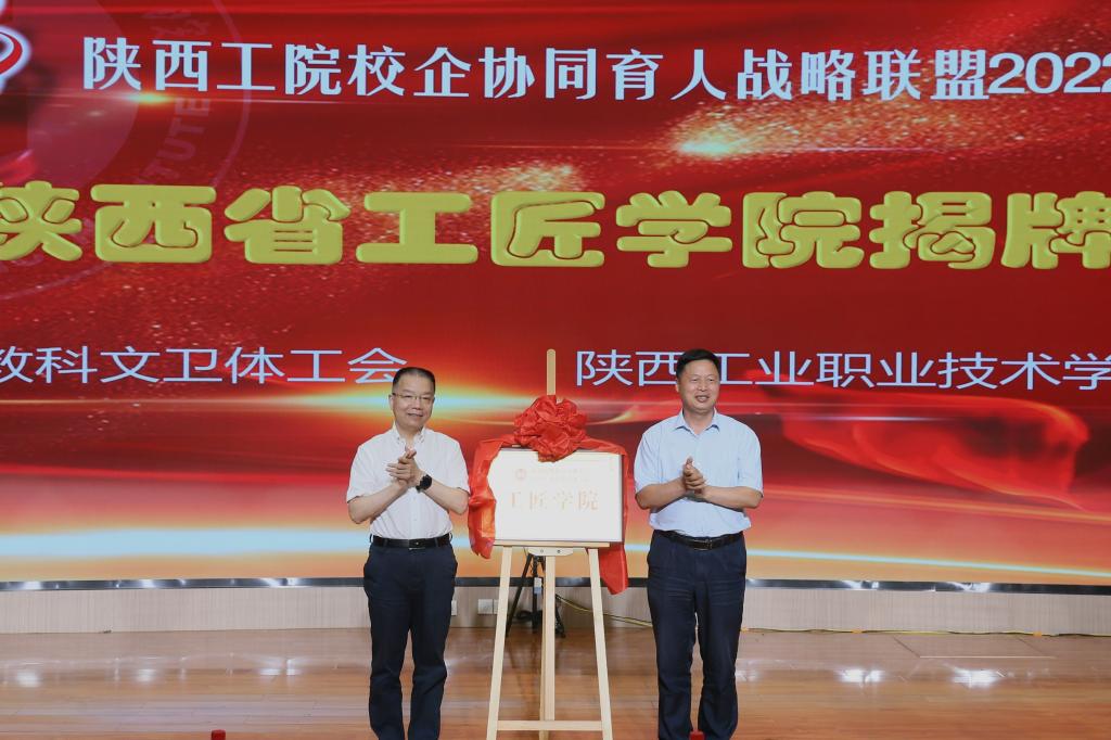 会上,陕西省教科文卫体工会主席徐富权和我校党委书记惠朝阳共同为工匠学院揭牌。