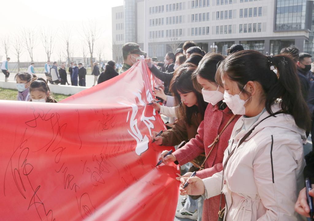 十年树木,栽种盎然春意;百年树人,涵养蓬勃精神。党委书记惠朝阳宣布“青绿经开 情满工院”活动正式开始,并与师生代表共同揭幕。全国师德标兵卢庆林教授、全国高校黄大年式教师团队负责人尚华教授、国家教学名师田锋社教授、全国优秀教师杨建民教授和学生代表,为以“明德 笃学 精艺 强身”的校训命名的4棵树木揭牌,师生在反映学校发展的73米横幅上签字留念,寄托对学校未来发展的殷切期望和炽热情怀。