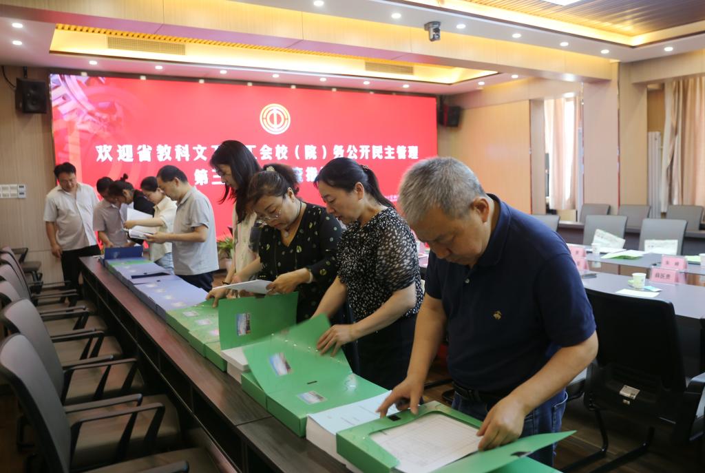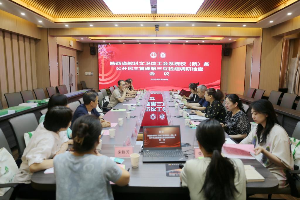 6月20日上午,陕西省教科文卫体工会校(院)务公开民主管理第三互检组来校检查工作。互检组由西安工程大学常务副主席张慧任组长,成员包括西北有色金属研究院工会副主席朱峰、西北有色金属研究院工会干事李波、陕西能源职院工会副主席李粒,陕西能源技校党委委员、教务科长江昆,通用环球西航医院(西安)有限公司工会委员邢竹萍、院务综合办干事张悦,西安外事学院工会干事王奕骁等。党委副书记田昊出席会议并致辞,工会主席张彬,院工会委员罗峰、张文亭,院工会委员、机关第二分会主席王荣琦,院工会委员、航空工程学院分会主席张旭,院经审委主任薛医贵,学生工作分会主席耿丽,机械工程学院分会主席郭旭华,电气工程学院分会主席张小洁,院女工委委员、公共教学分会主席吕海侠,职工代表宋群芳、柴继红出席了座谈会,会议由互检组组长、西安工程大学常务副主席张慧主持。