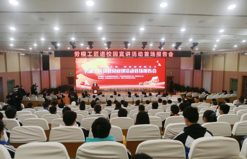 12月23日,由陕西省委宣传部、陕西省委教育工委、陕西省总工会主办,陕西省教科文卫体工会和我院共同承办的劳模工匠进校园宣讲活动首场报告会在我院学术会堂隆重举行。省人大常委会副主任、省总工会主席郭大为,陕西省委教育工委委员、省教育厅副厅长朱晓渭,陕西省委宣传部副部长柯昌万,陕西省总工会党组副书记兰新哲,咸阳市委常委、统战部长、市总工会党组书记李晓静,我院党委书记惠朝阳、院长刘永亮出席活动。省委宣传部、省教育厅、省总工会相关处室负责同志,部分高等职业技术学院校领导,我院领导及师生代表200余人参加了活动。报告会由省委宣传部副部长柯昌万主持,全省共计37万余人通过线上直播的方式与现场师生共同聆听了报告。